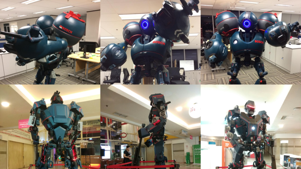 Two promotional robot figures built for Bosch Indonesia, developed from early design briefs into tangible 3D promotional props.